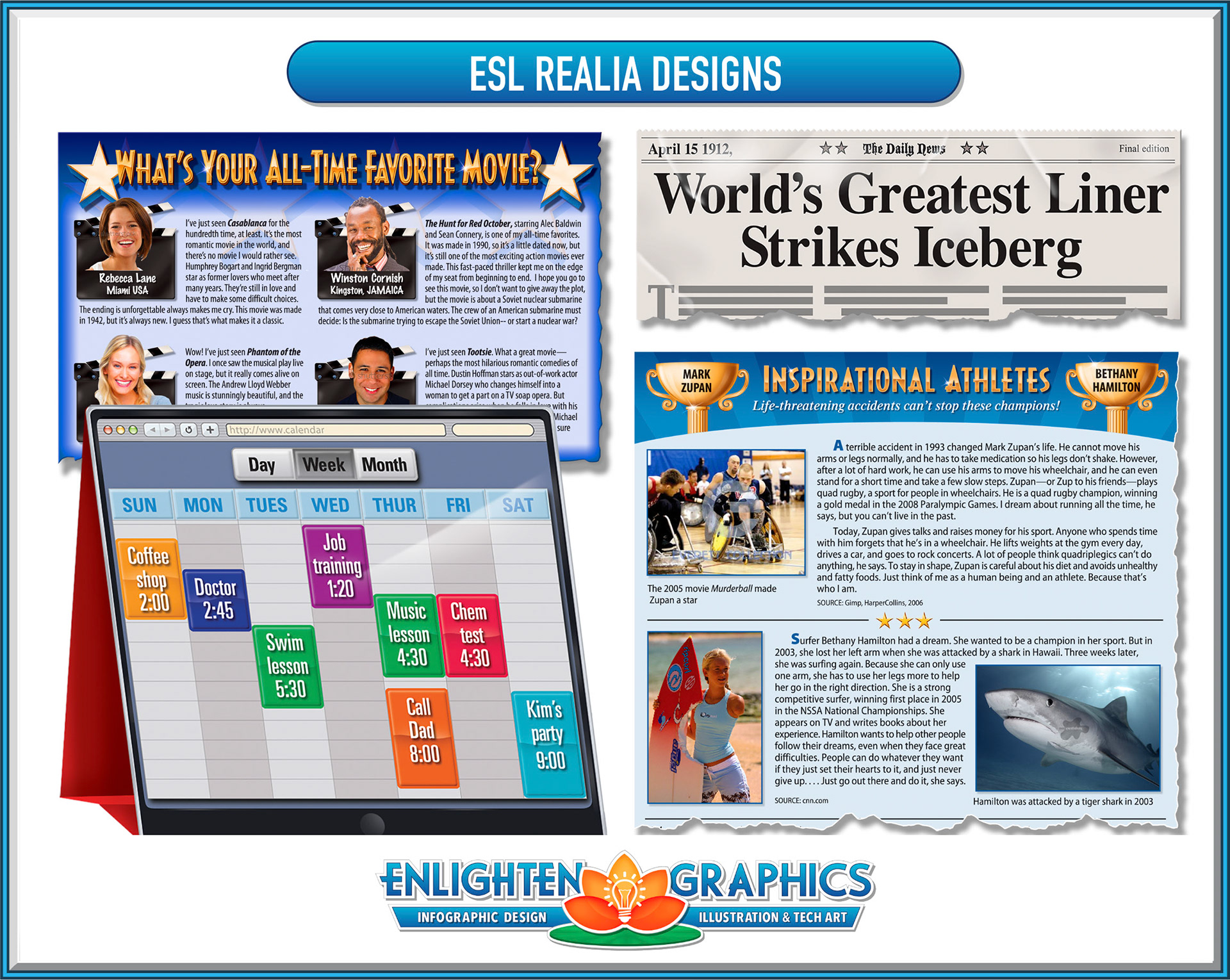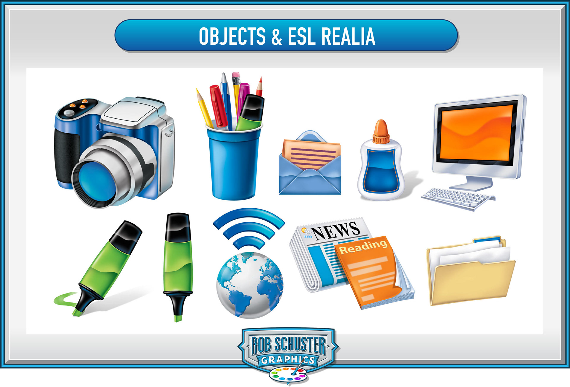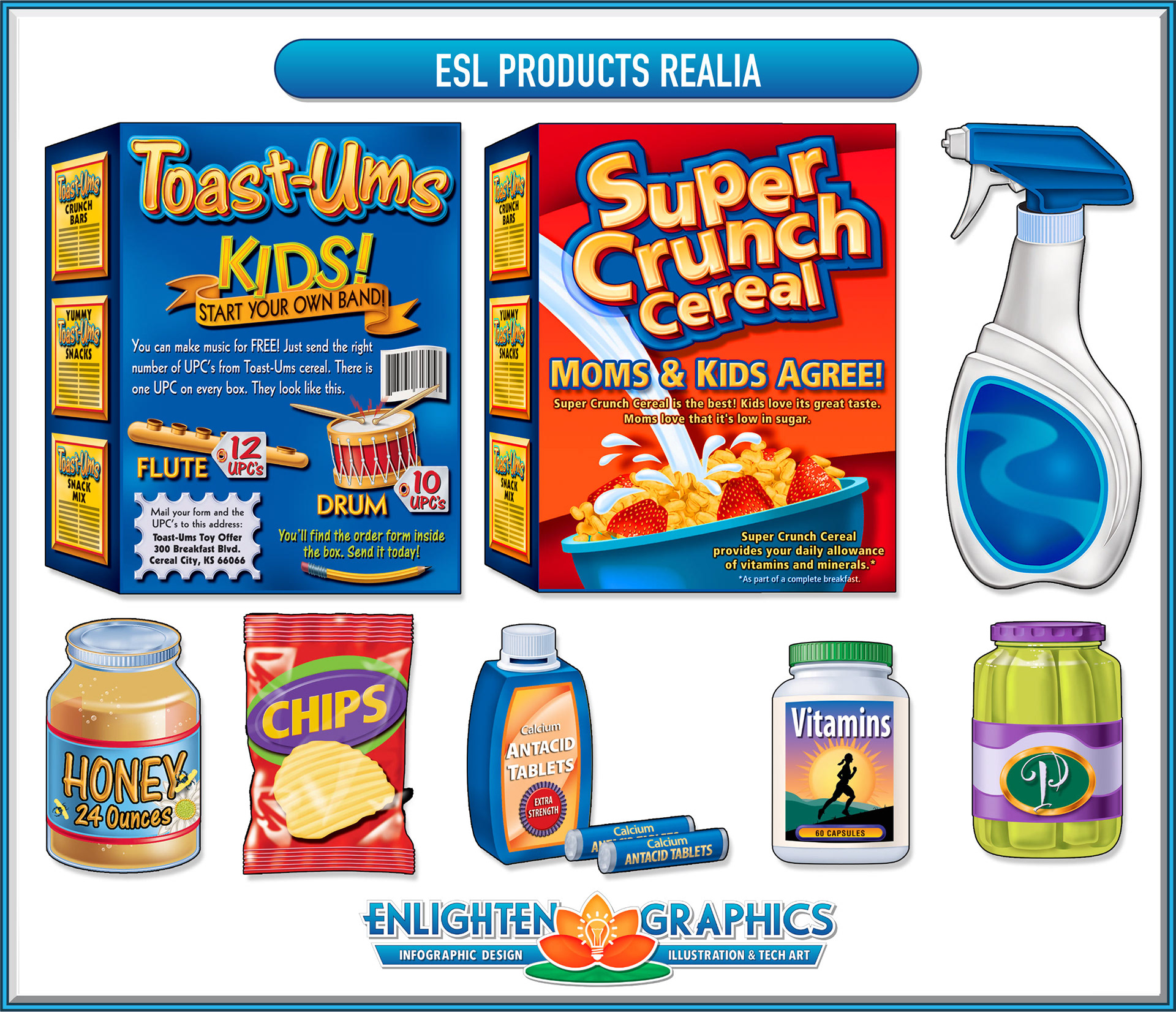 ESL realia graphics are used to promote learning and discussion for those learning English as their secondary language.