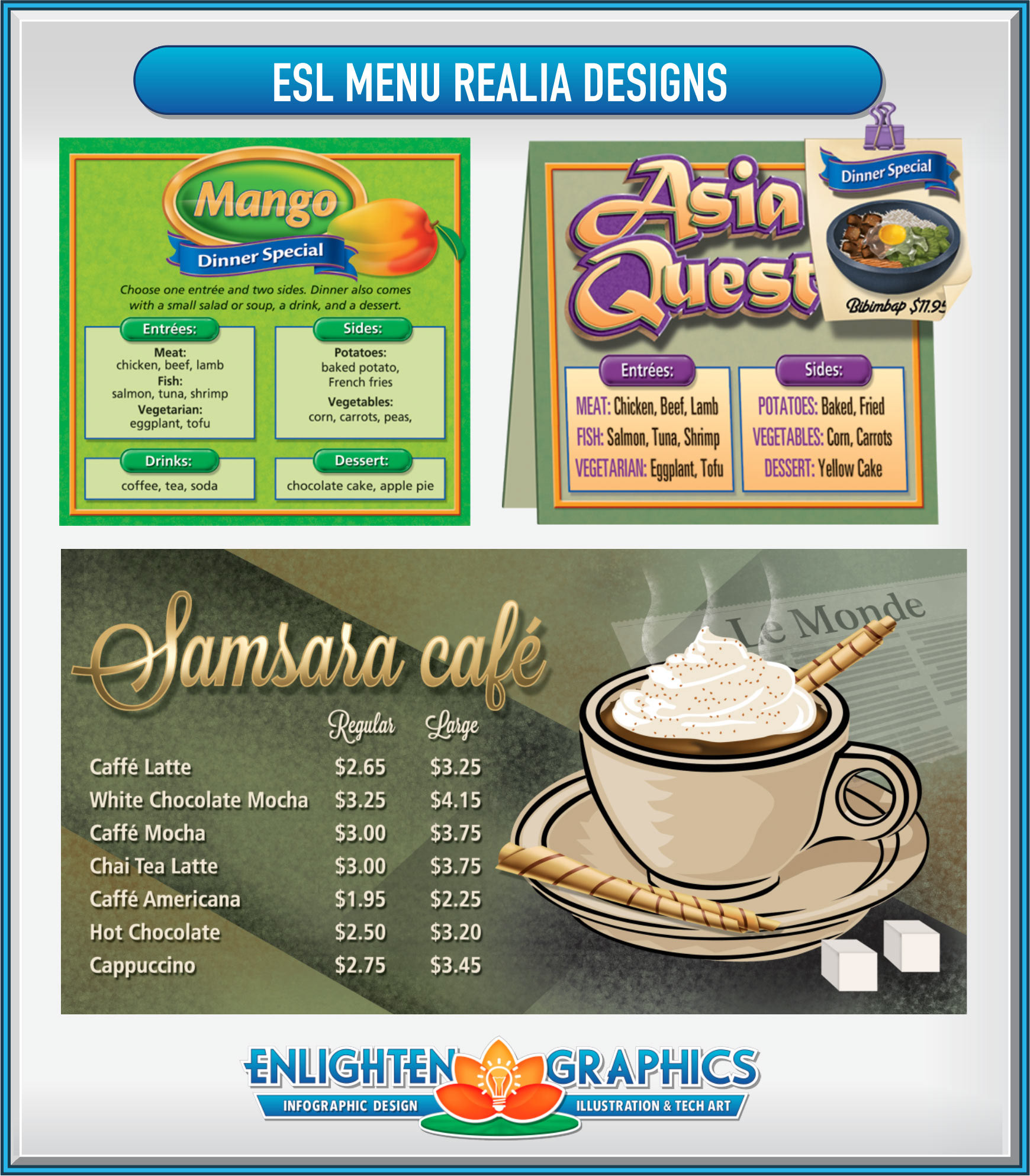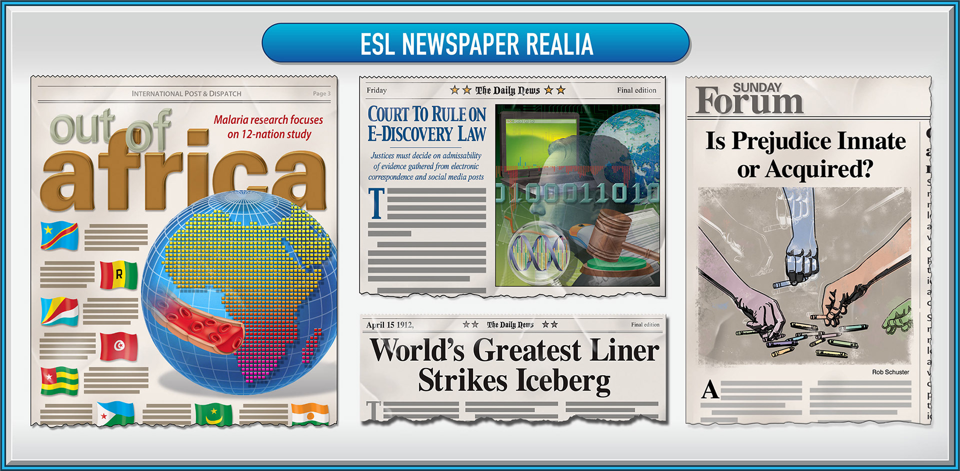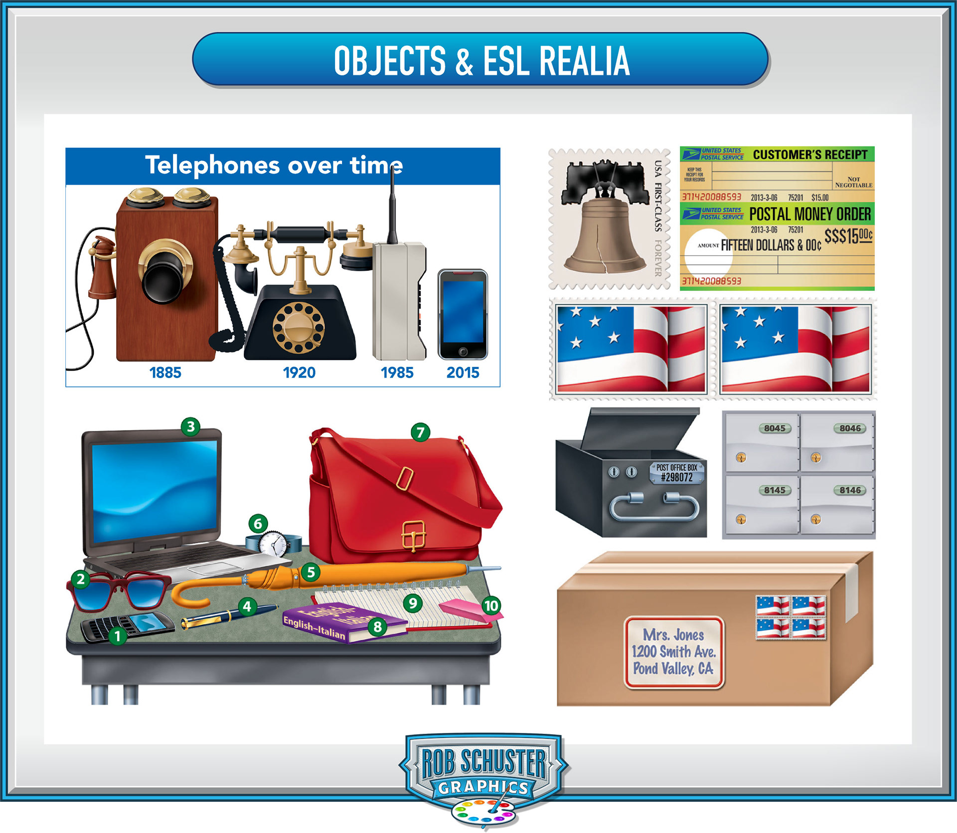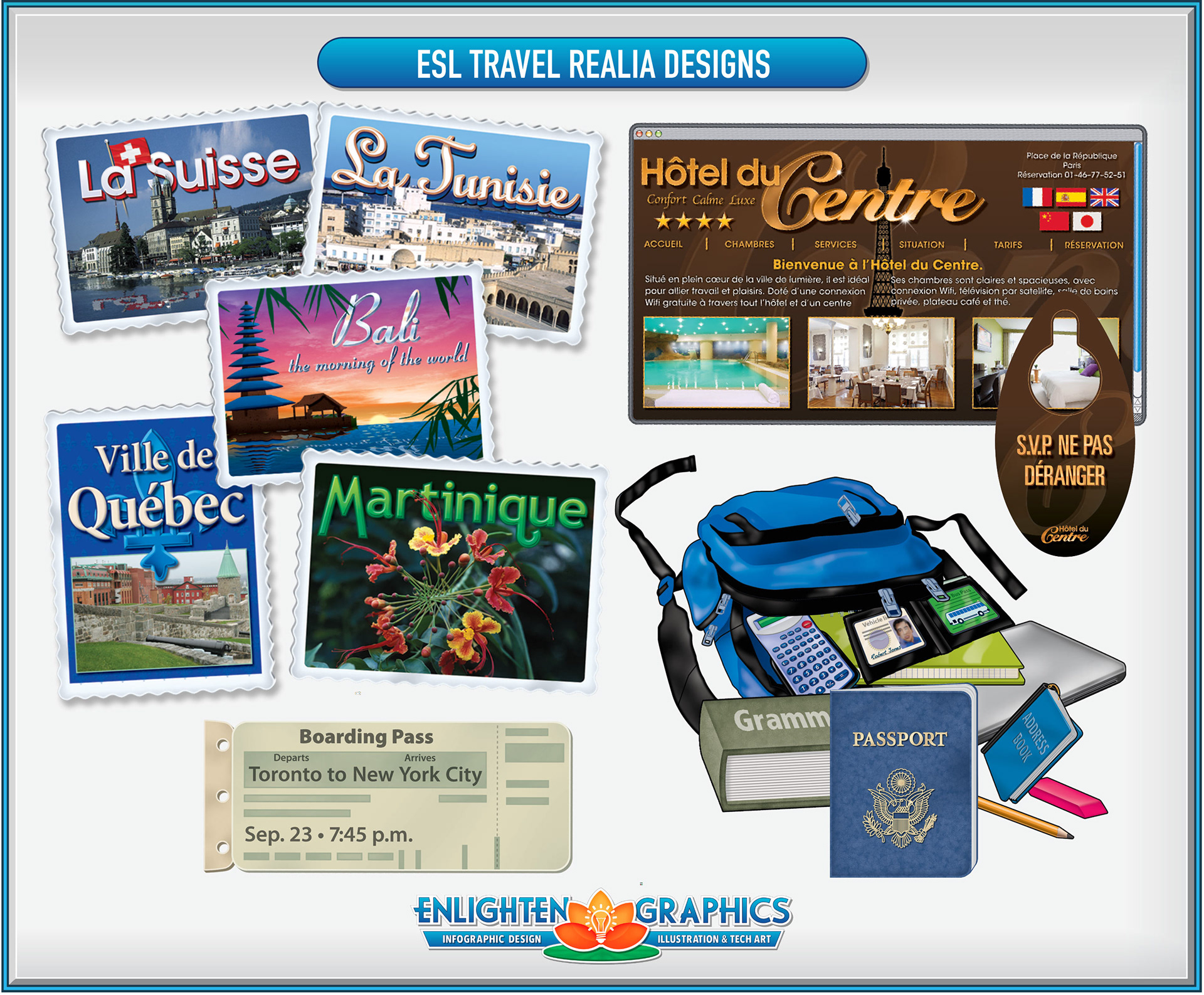 ESL realia graphics are used to promote learning and discussion for those learning English as their secondary language.