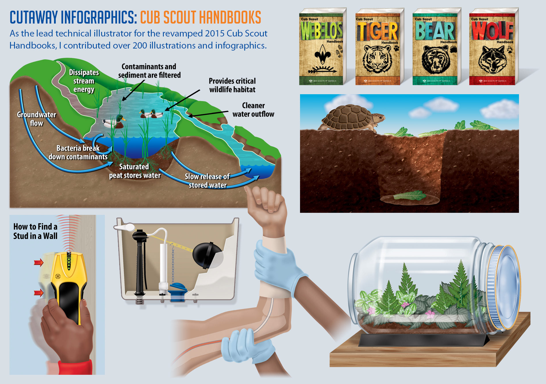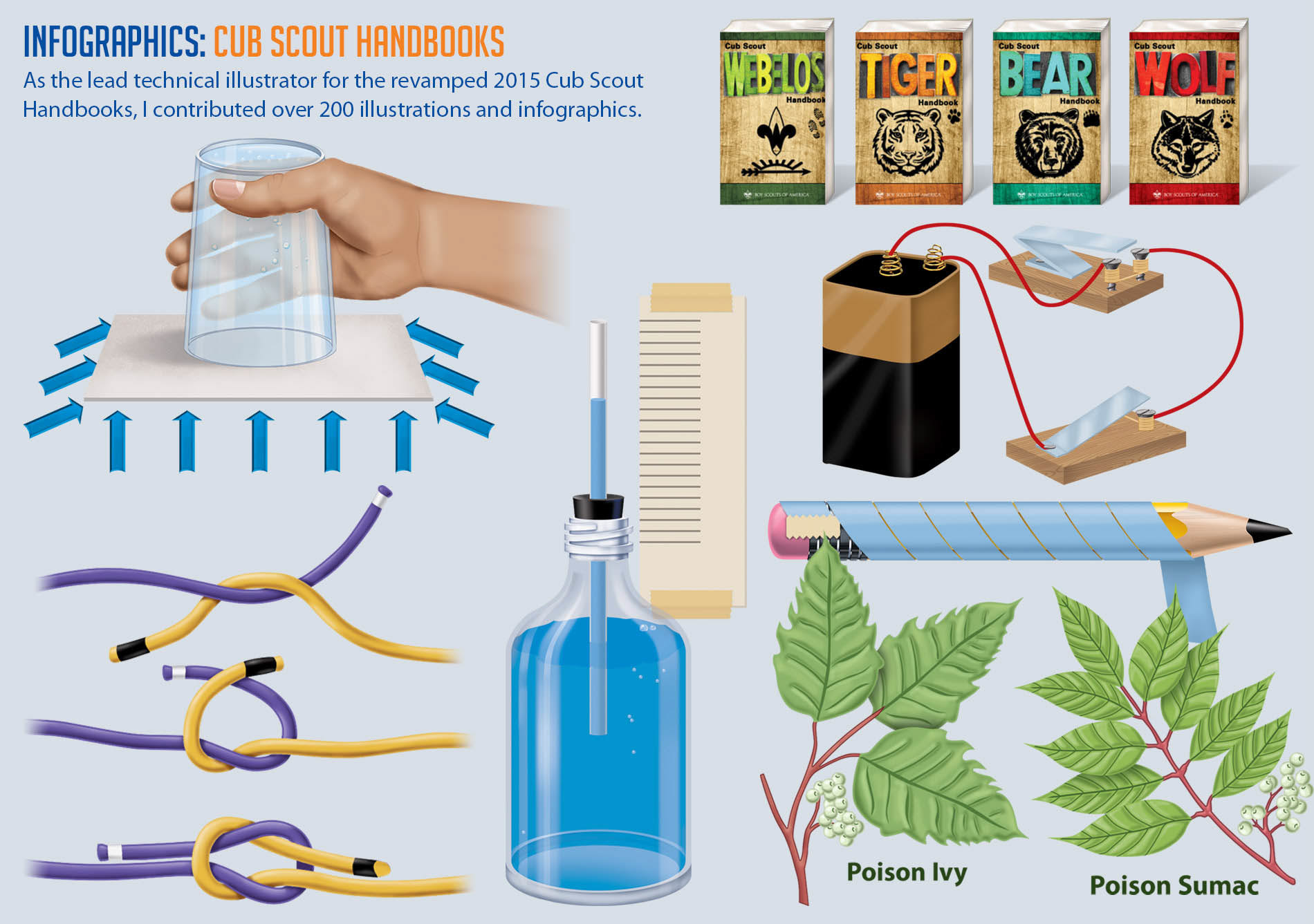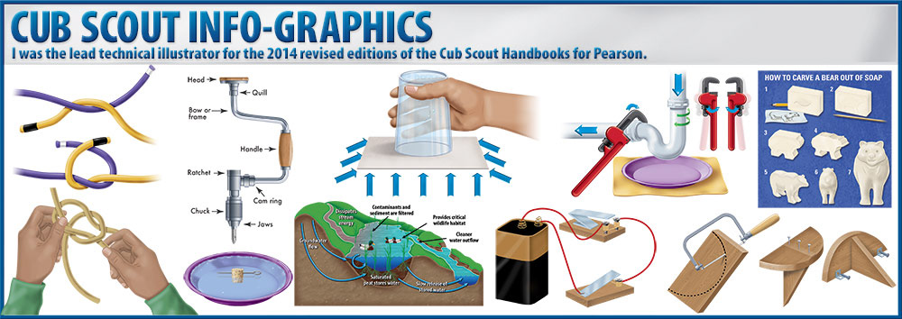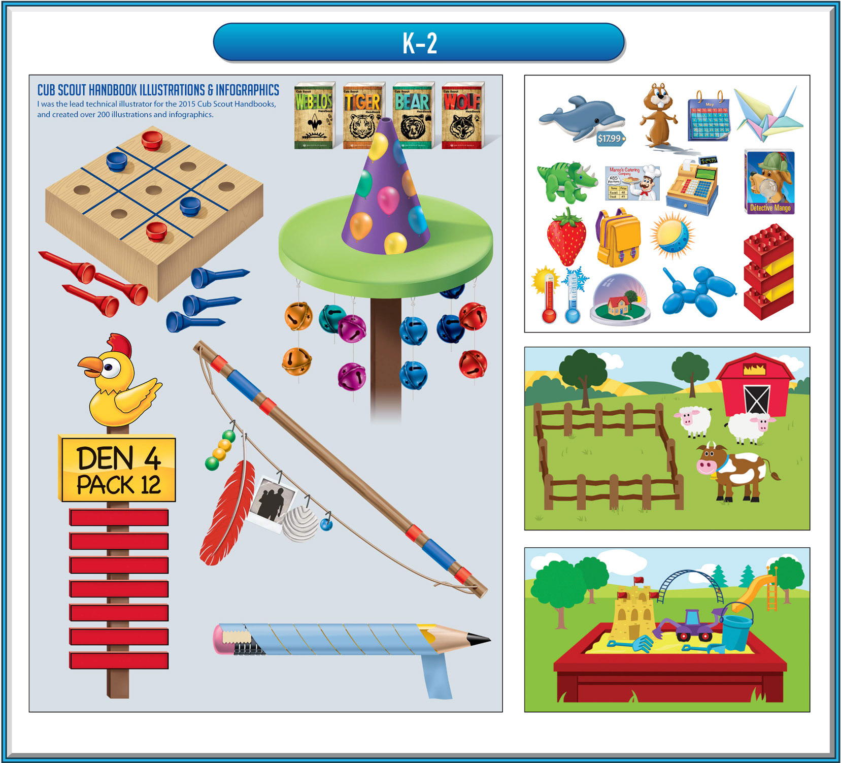 These are educational graphics and illustrations for grades K–6th including math, and science along with some of the many graphics we created for the Cub Scout Handbooks.