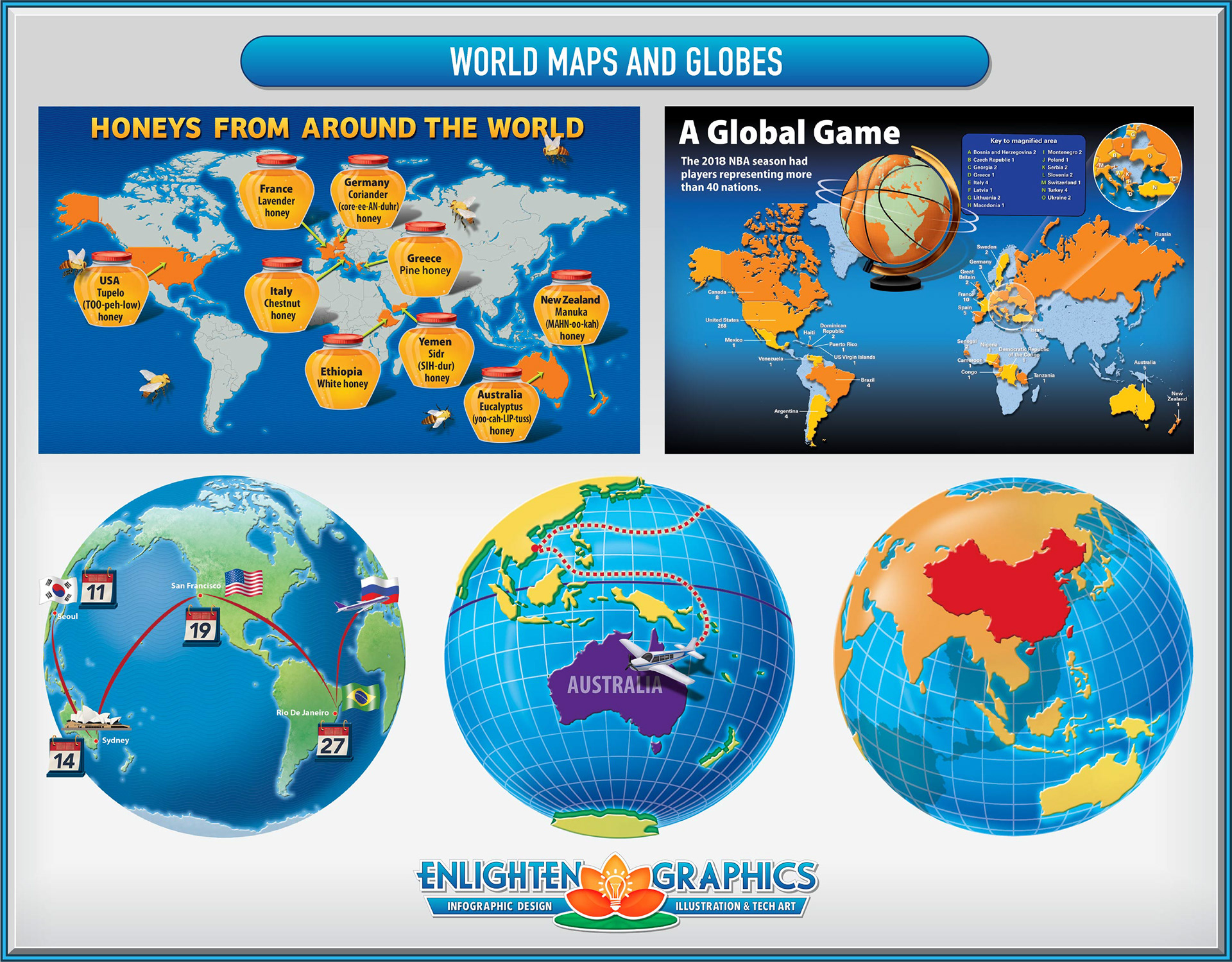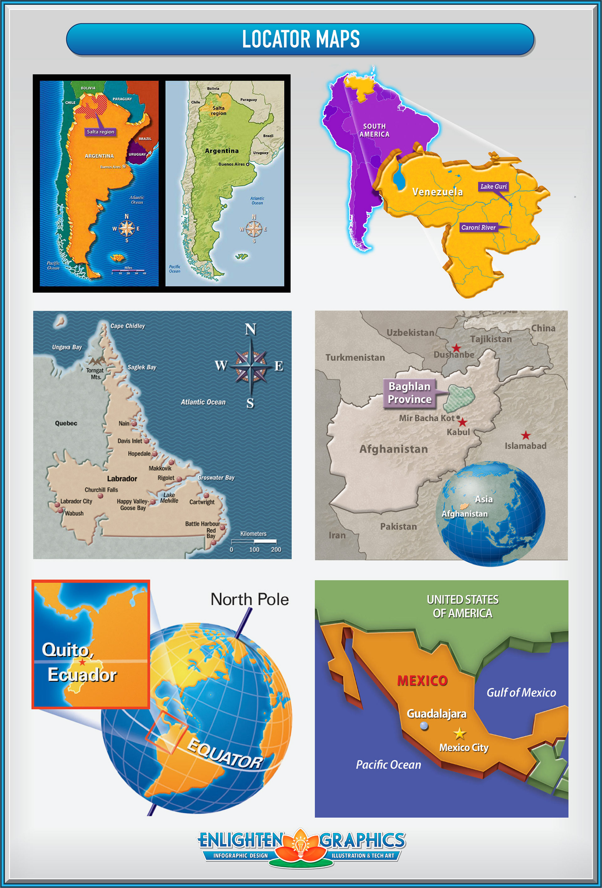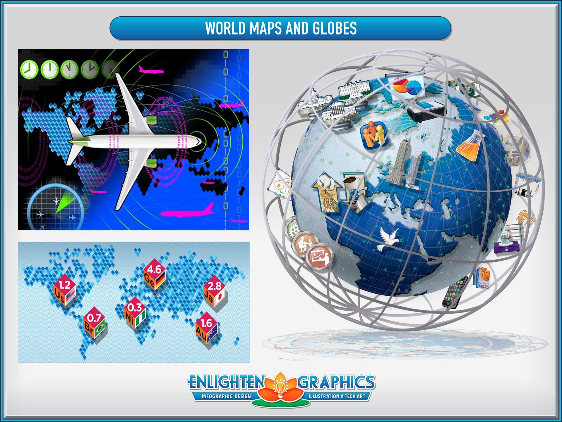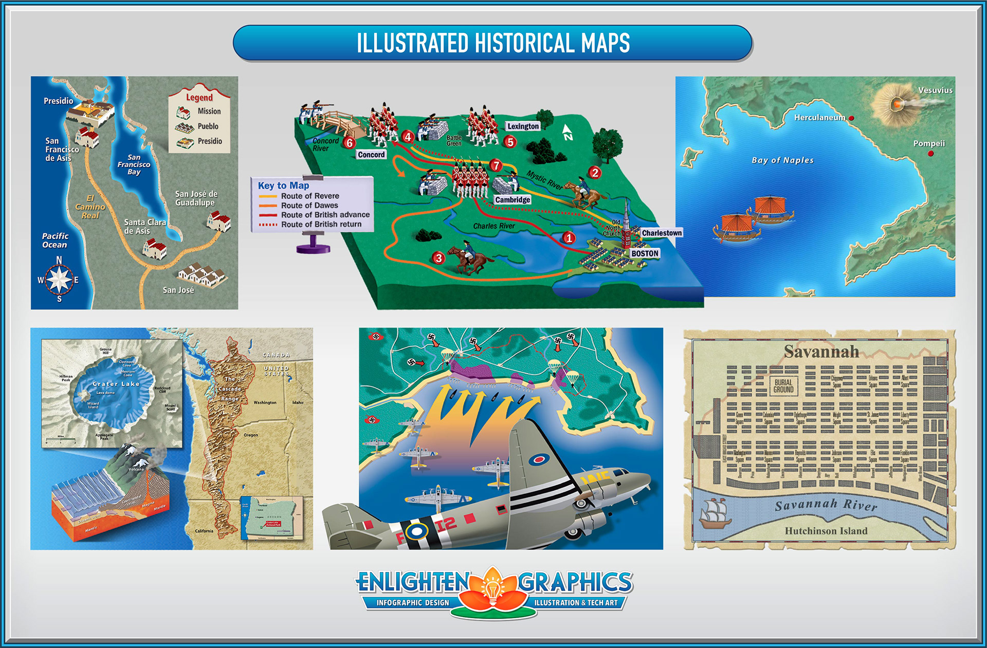 Samples of locator maps, illustrated maps, historical maps, world maps and globes.