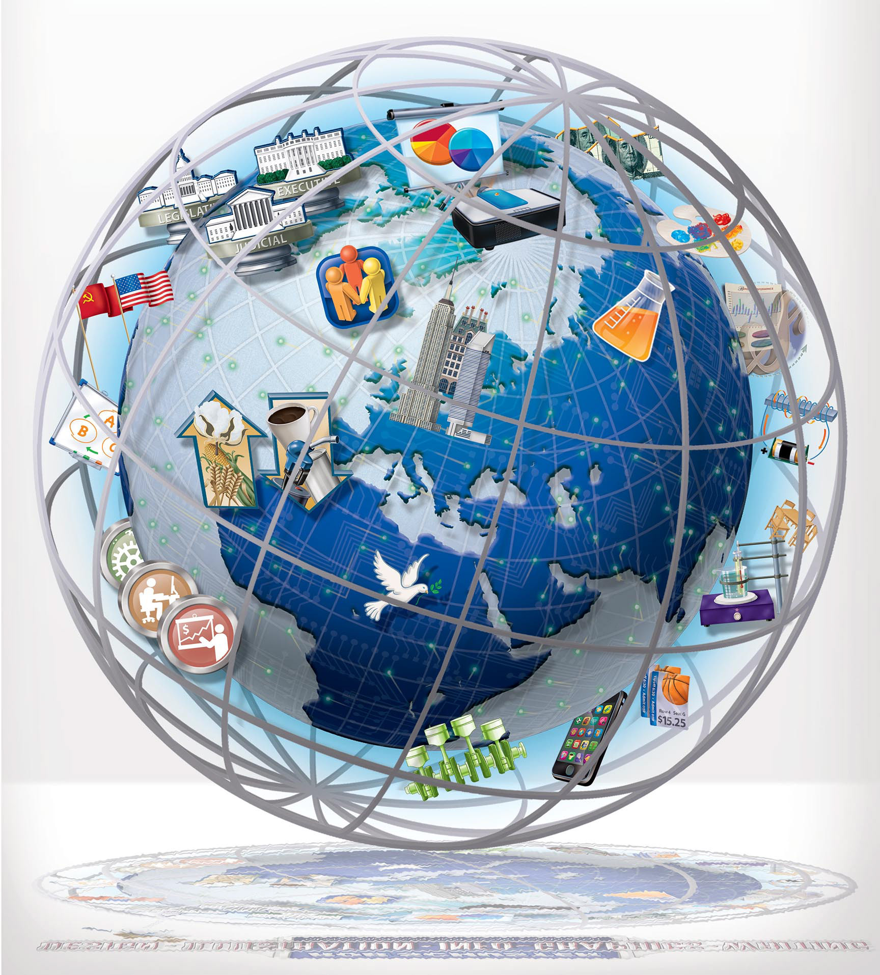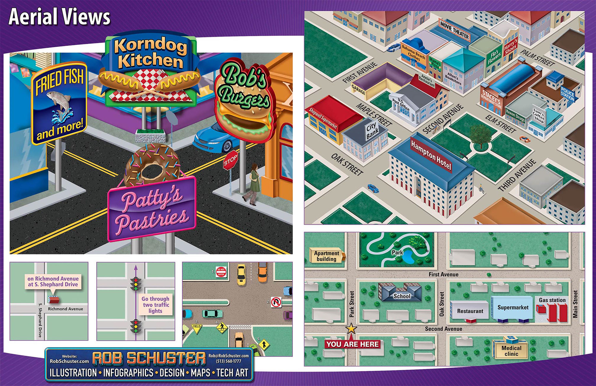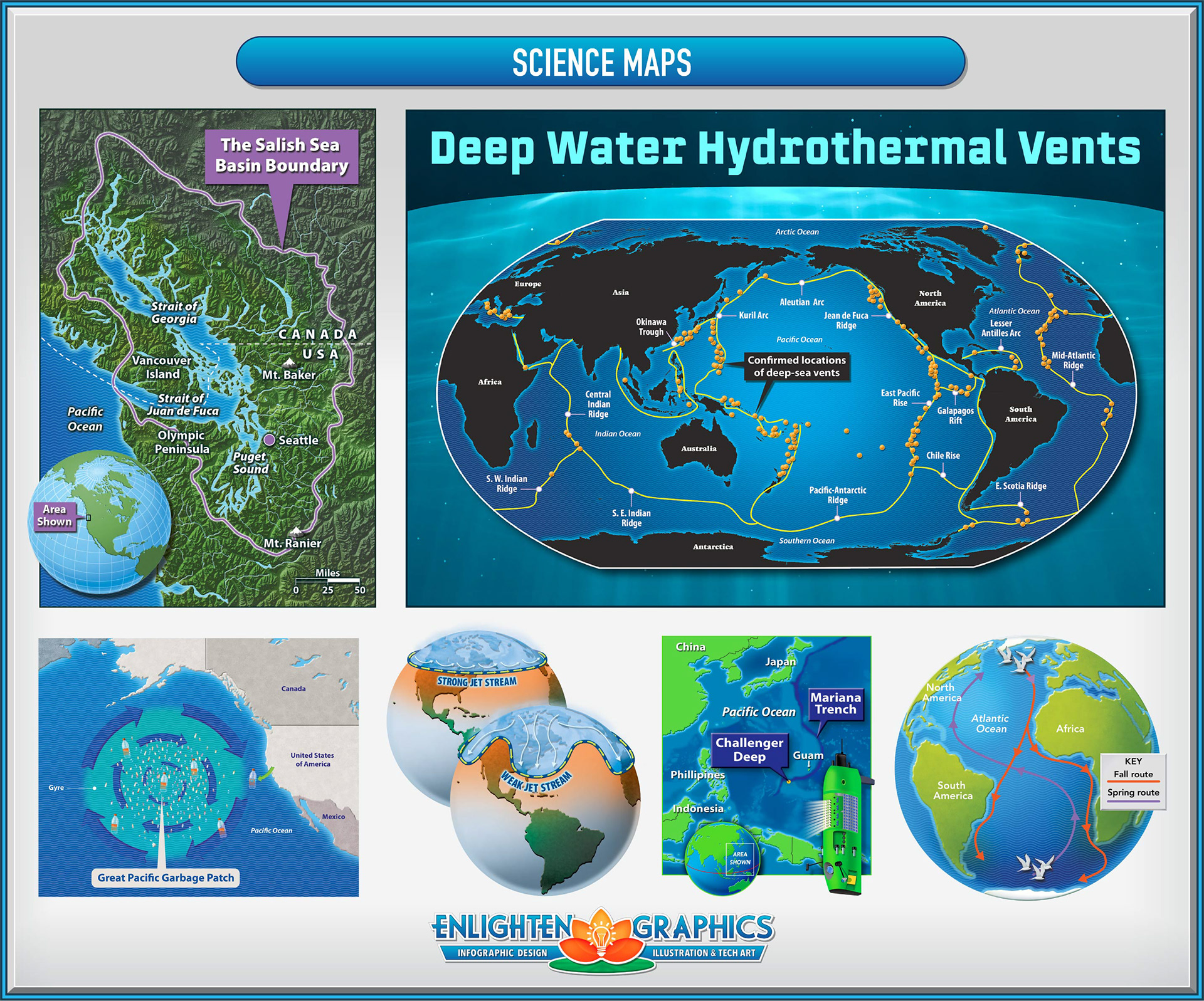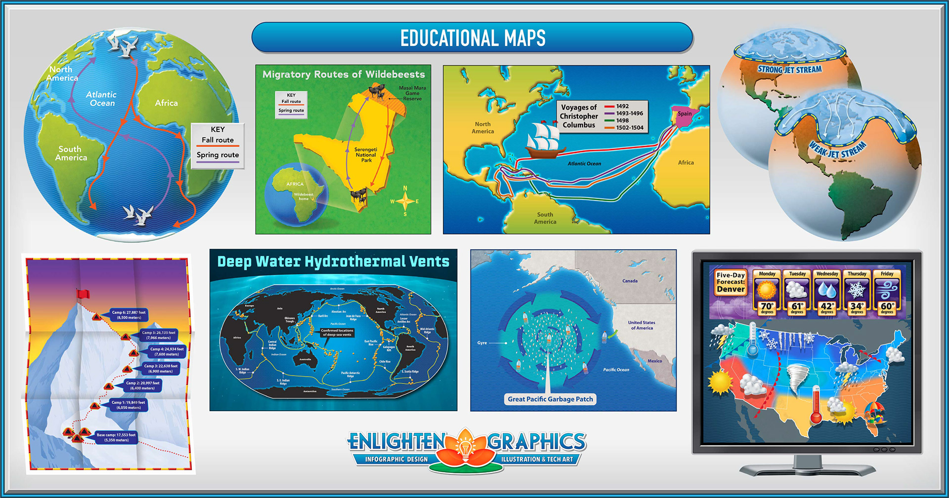 Samples of locator maps, illustrated maps, historical maps, world maps and globes.